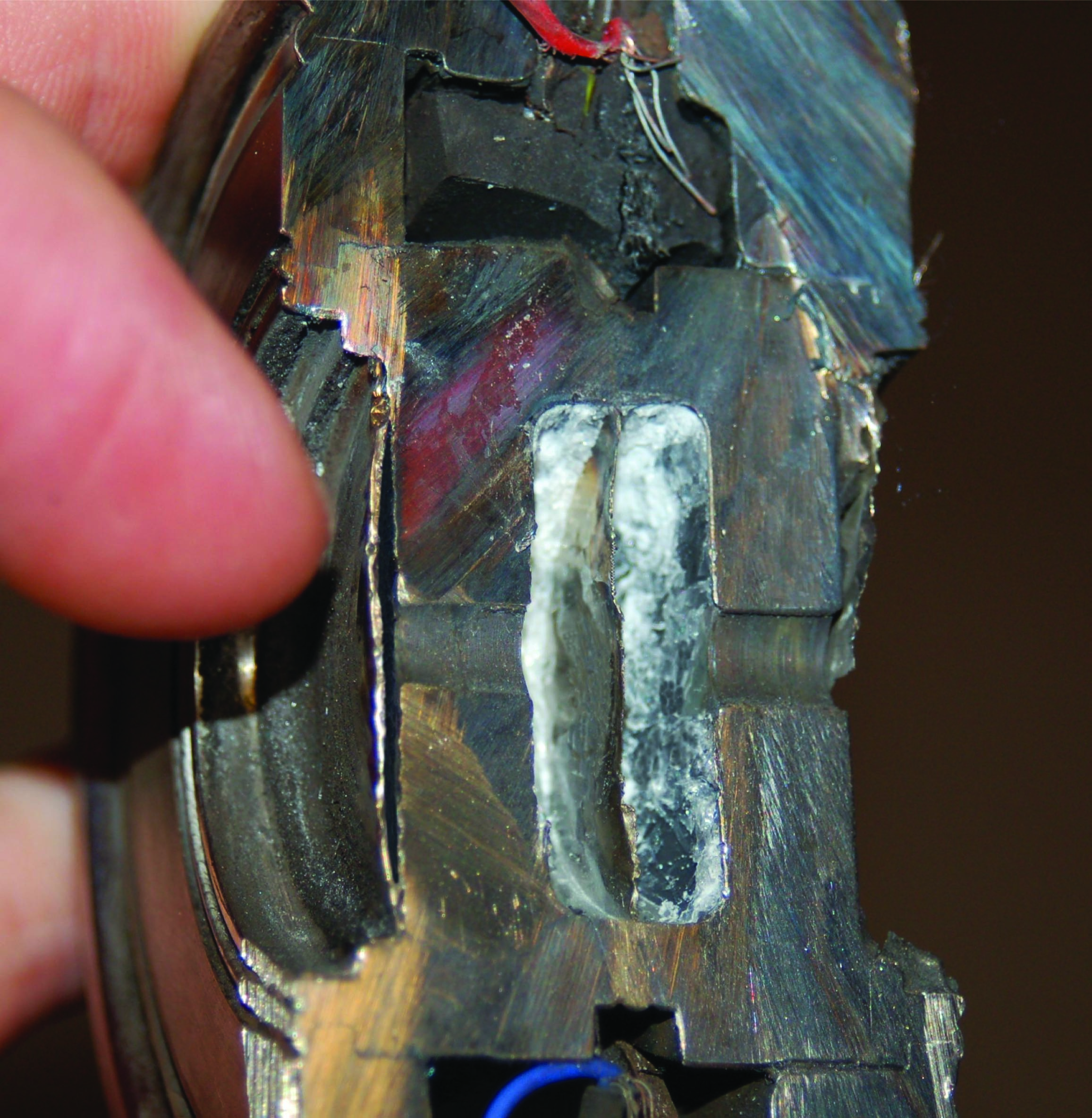 The interior of the same differential capacitance sensor (revealed by cutting a Rosemount model 1151 sensor in half with a chop saw) shows the isolating diaphragms, the sensing diaphragm, and the ports connecting them together:
