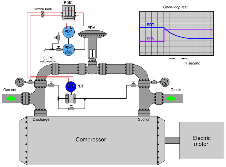 This control system measures and regulates the amount of differential pressure across a gas compressor, by opening a recirculation valve to let high-pressure discharge gas go back to the low-pressure “suction” of the compressor. This control system needs to be very fast-acting, and currently it is anything but that, as revealed by the open-loop trend shown in the upper-right of this illustration: